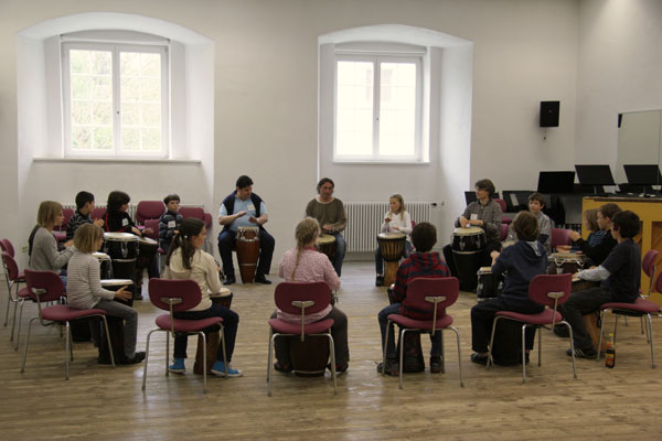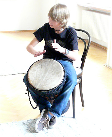 Jojo Schick, Musiker und Diplom Musiktherapeut, ist unser Dozent für Rhythmus. Ohne Kontrabass - dafür aber mit der Djembe erleben die Schüler das komplexe Thema Rhythmus auf neue Art und Weise.